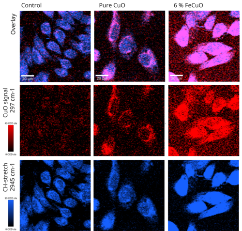 At IfADo, the cell responses caused by the particles developed at IWT are analysed using different cancer cell lines as well as liver cells and cells of the nervous system. Cells of the cancer cell lines will be compared to those of the non-cancerous cell lines to gain insights into possible thrapeutic strategies. After the toxic concentrations for the cells have been determined, non-toxic concentrations are used for further investigations.: With the help of RNA sequencing, molecular signatures of the different doping strategies are determined. Raman spectroscopy is used to investigate into which cell compartments the particles become incorporated.